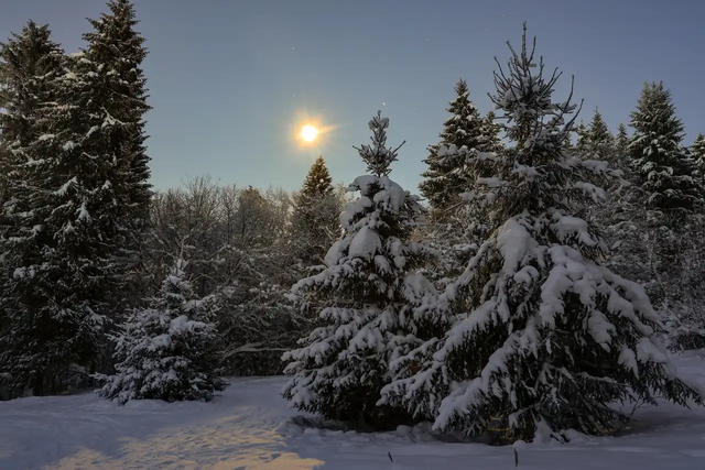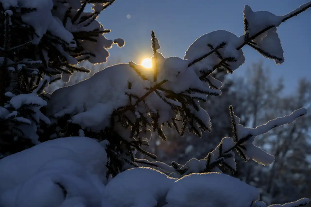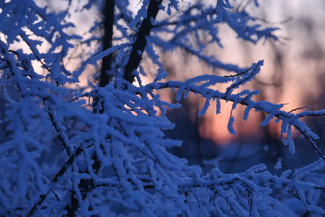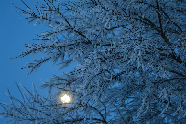 外面零下三十度,车子电瓶没电了,我没敢用变稠的机油去冲洗。但我还是想拍照,尤其想拍下霜冻笼罩的蓝色时刻,以及冉冉升起的明月。