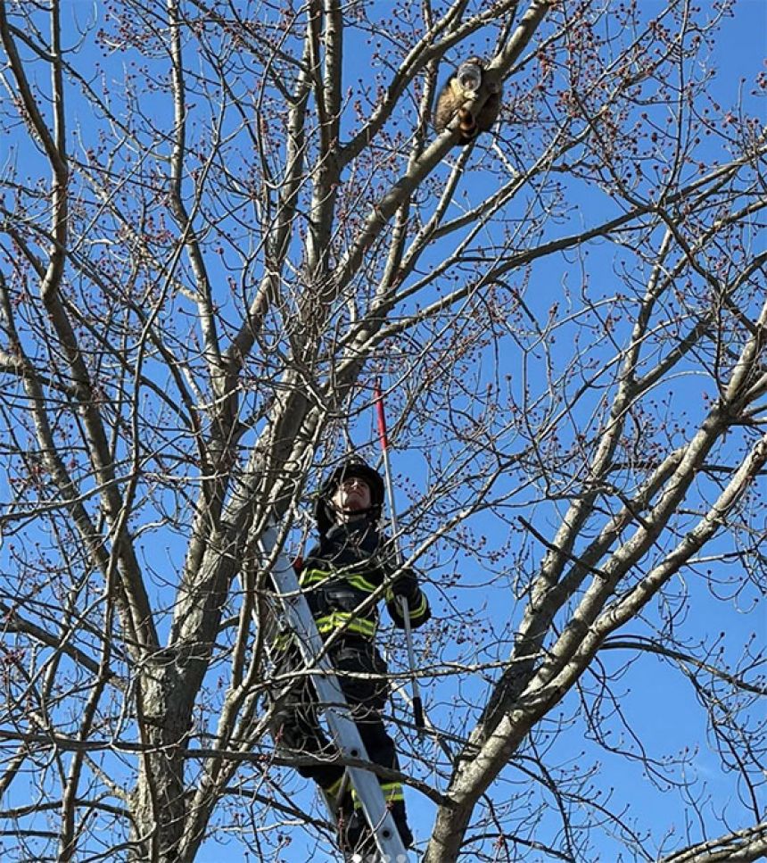 以大尺寸看这个图像消防队出动,展开救援工作接到报警的谢尔班消防署的队员们到达现场后,看到了不幸的浣熊紧紧抱住树枝的身影!