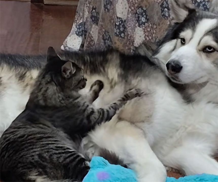 西贝里安·哈士奇非常喜欢从同居的猫那里得到极好的按摩。但是不能说是免费的。作为回报,猫要求哈士奇的重要米饭。